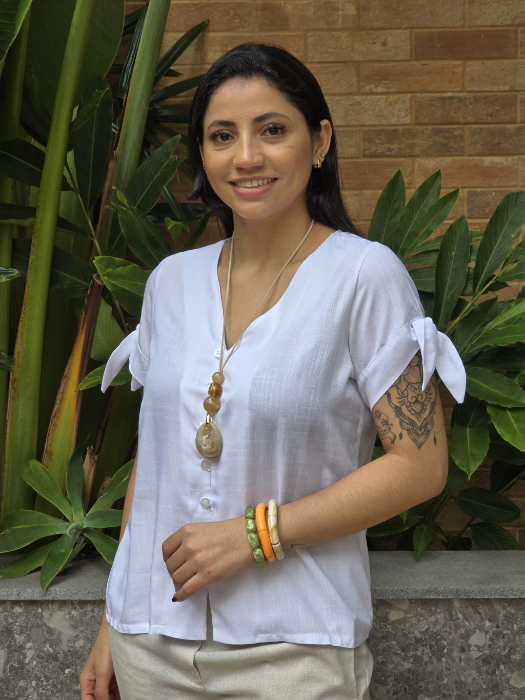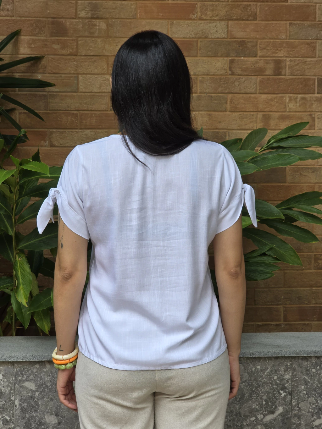 Blusa 100% viscose com decote v e laco na manga que da um charme nessa Blusa básica