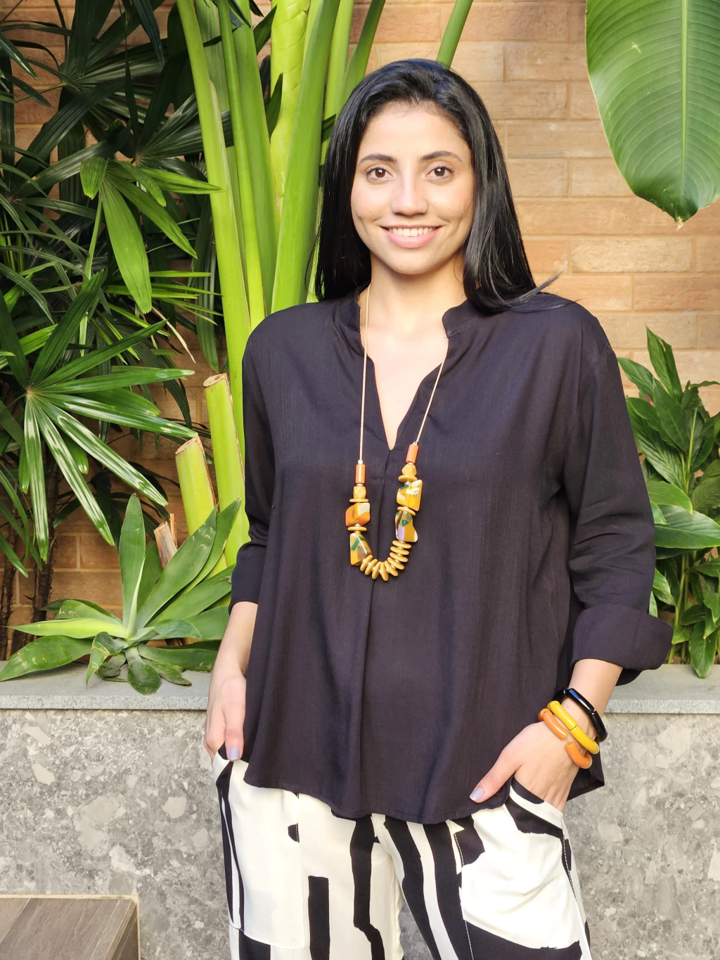 Blusa 100% viscose, com gola tipo padre e manga 7-8 com detalhe no punho