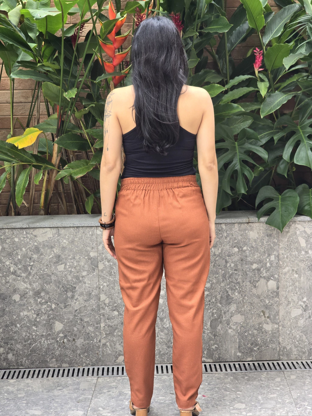 CALÇA CIGARRETE COM BOLSO E CÓS DE ELÁSTICO NA PARTE DE TRÁS
