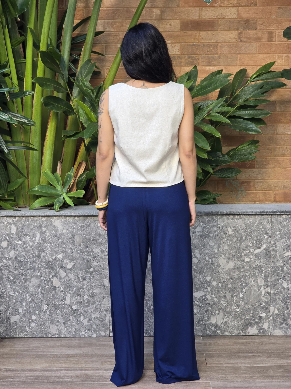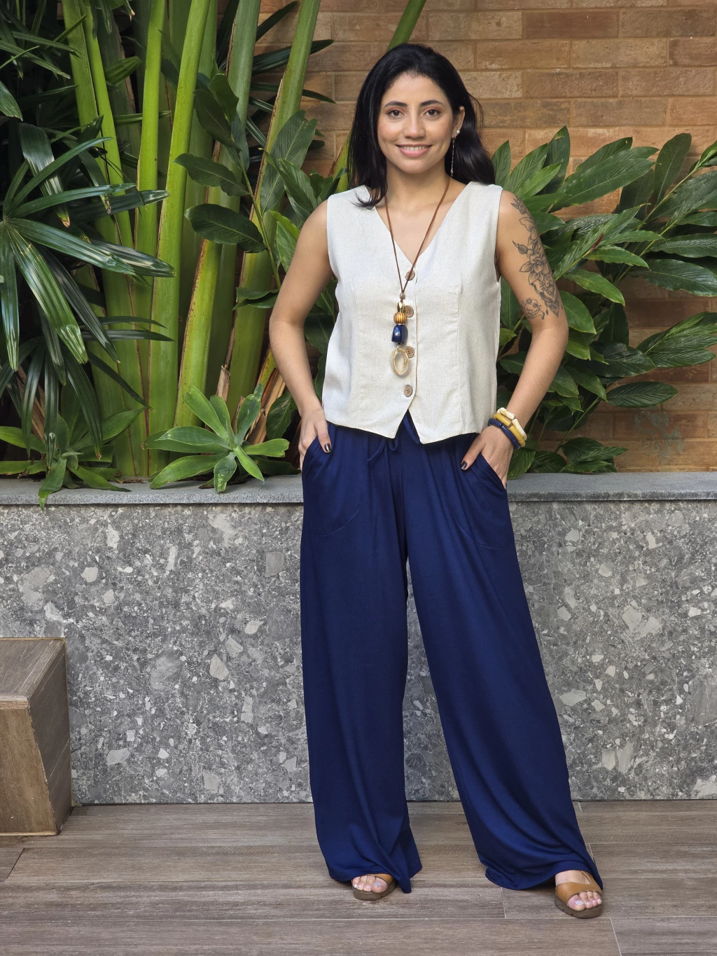 CALÇA PANTALONA COM CÓS DE ELÁSTICO E BOLSO