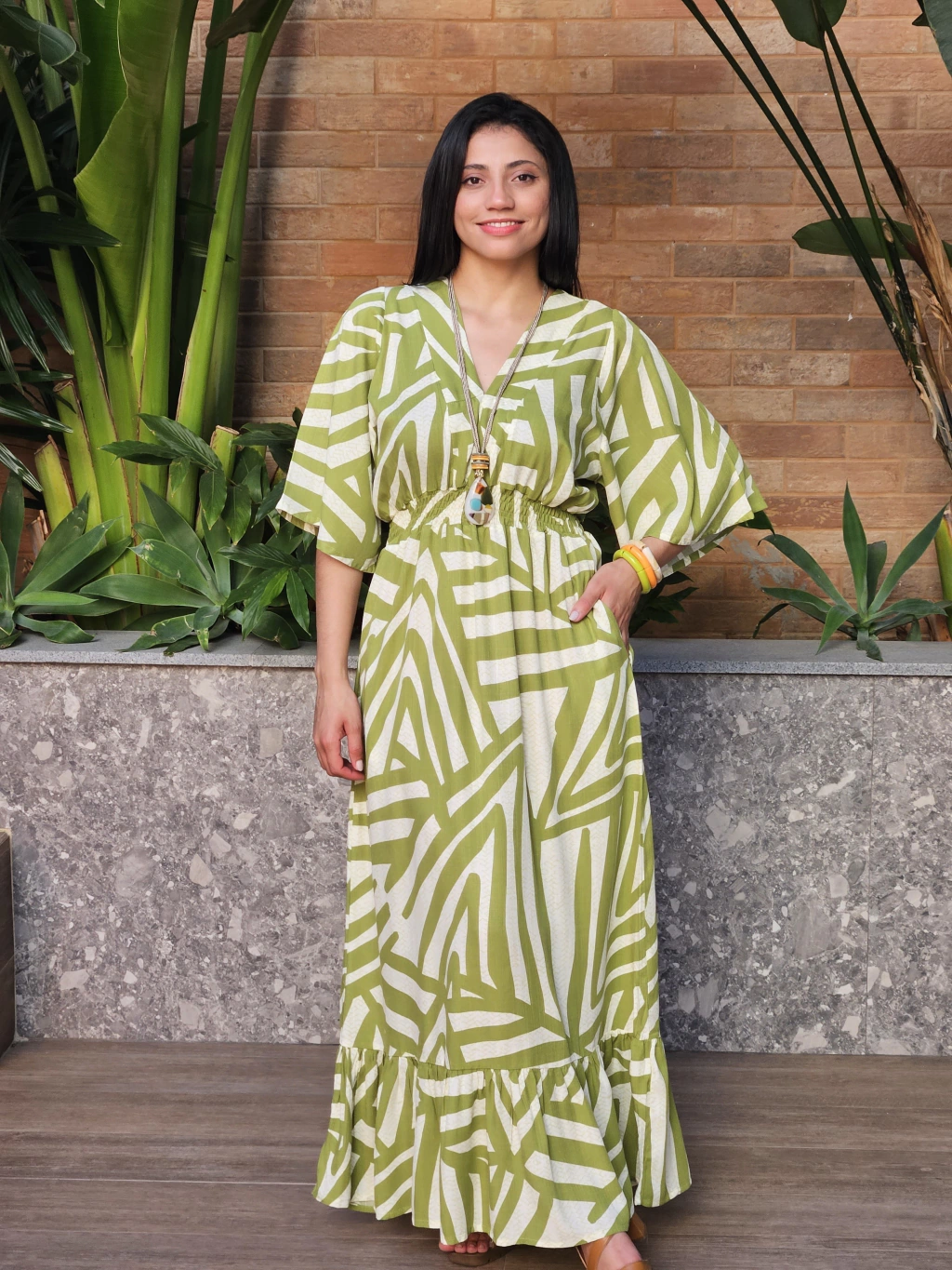 Vestido 100% viscose decote V Pala manga ampla com bolso e elástico abaixo do busto